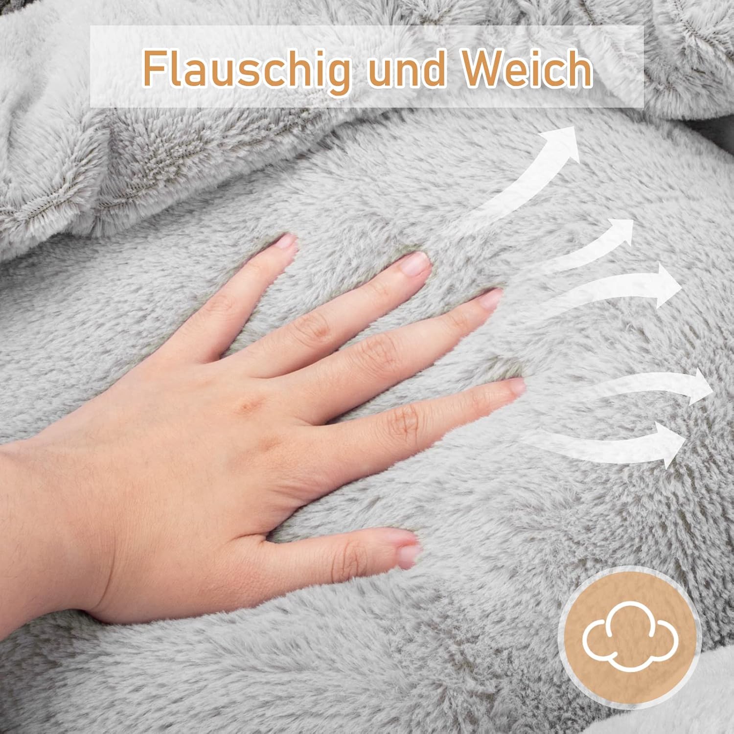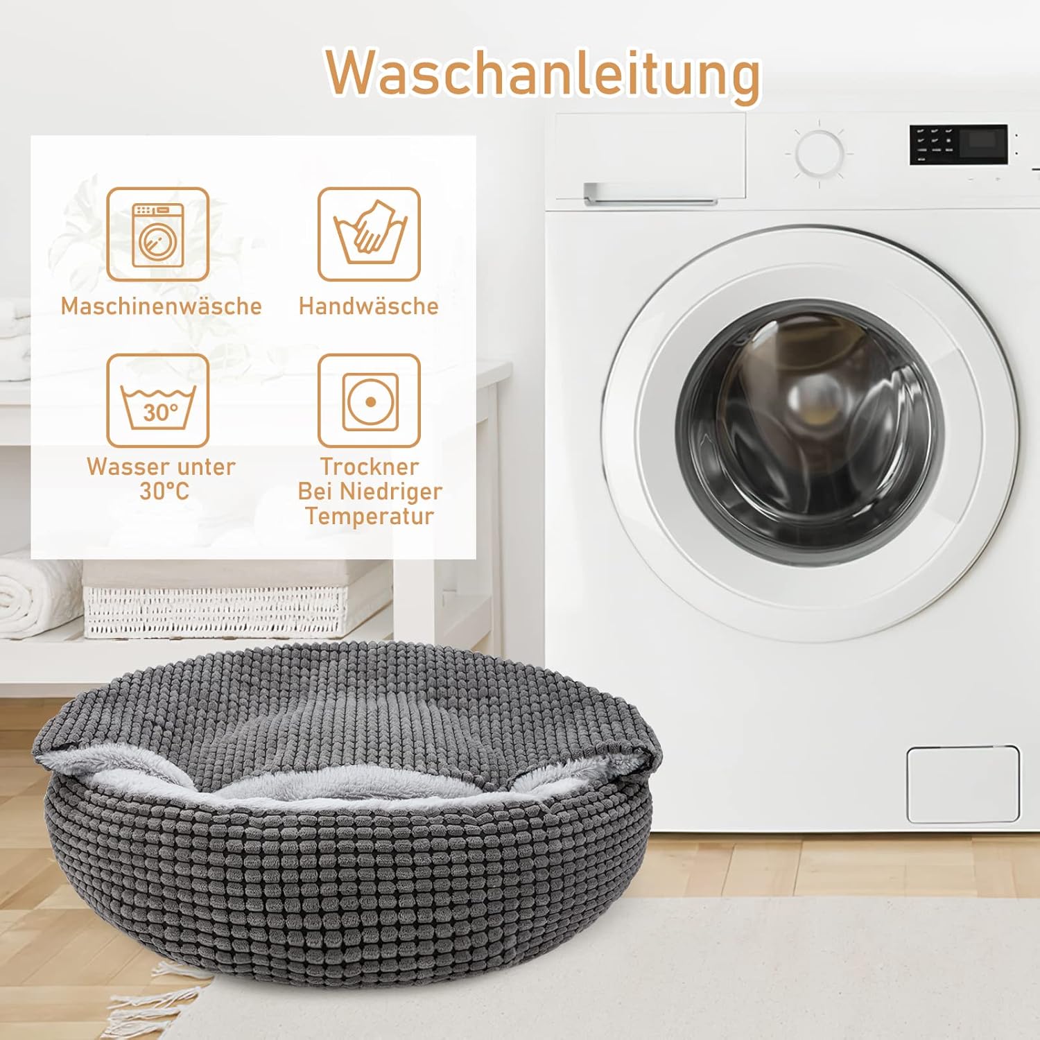 Soft round pet bed with hooded blanket for dogs or cats up to 30 lb. Made from flannel and PP cotton for comfort and warmth. Features raised edges for head support and a non-slip bottom for stability. Lightweight and machine washable.